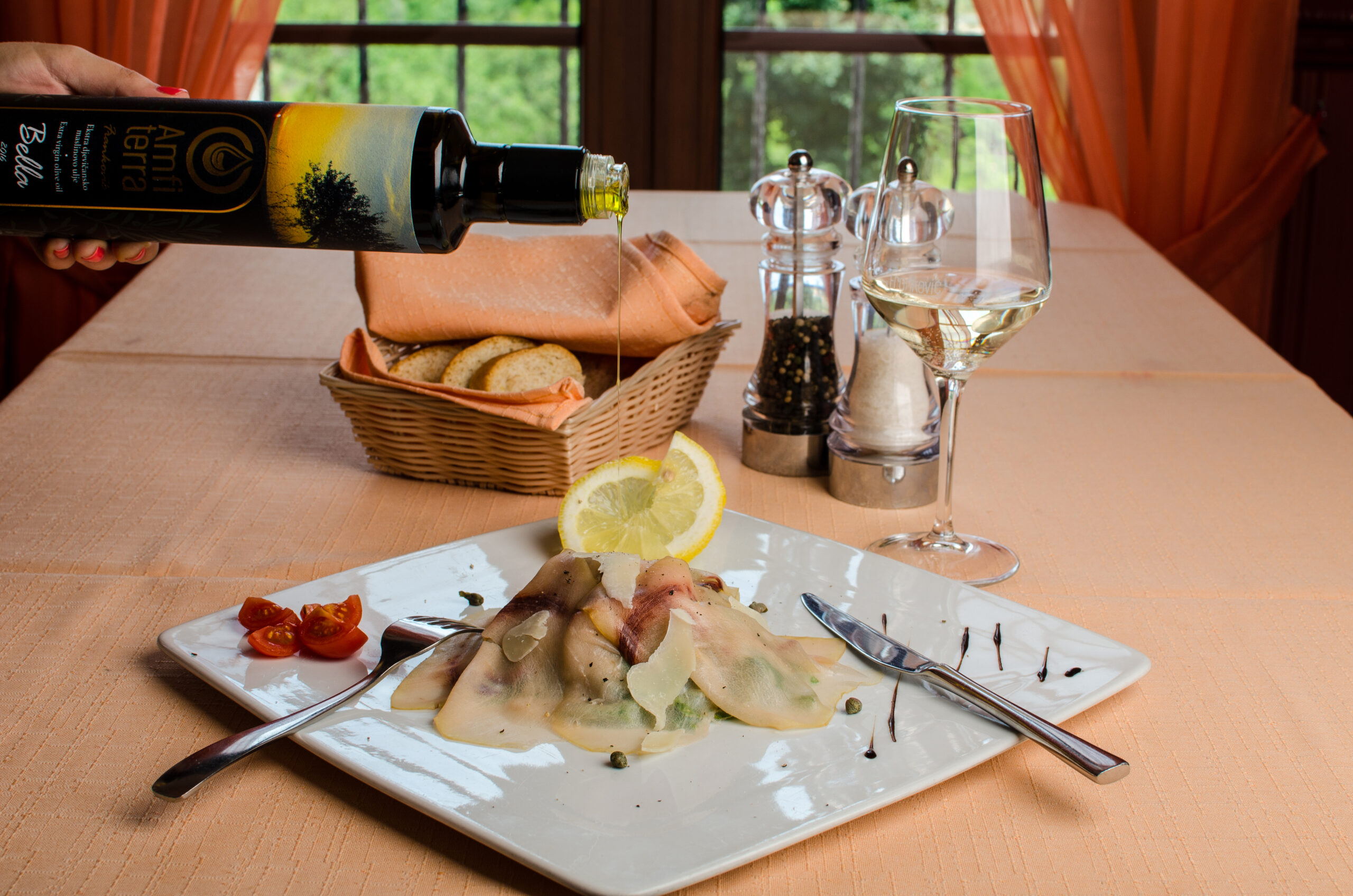 Kuhani i pečeni specijaliteti kuhinje Oštarija Rondo, savršeno se sljubljuju s njihovim maslinovim uljem koje tanjuru daruje podanost, pritom stvarajući usklađene okuse povezane kapljicama vrhunskog maslinovog ulja koje nježno zadirkuje pripremljeni slijed, ali i nepce svakoga gosta. Amfiterra izvrsno ide uz riblje i mesne delicije, ali i raznovrsno povrće, juhe, salate i umake, kao i brojne druge kreativne delicije koje se pripremaju u kuhinji ove konobe.